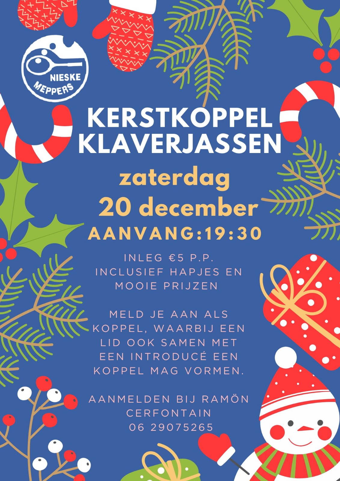 Zaterdag 20 december is er weer klaverjassen bij ons in de kantine. Dit keer is het koppel klaverjassen. Dus geef je op samen met een maatje en misschien win je mooie prijzen. Als lid mag je ook een introduce meenemen als koppel. Inleg voor deze avond is 5 euro per persoon inclusief lekkere hapjes. Geef je op bij Ramön voor 19 december tel: 0629075265. Tot dan.