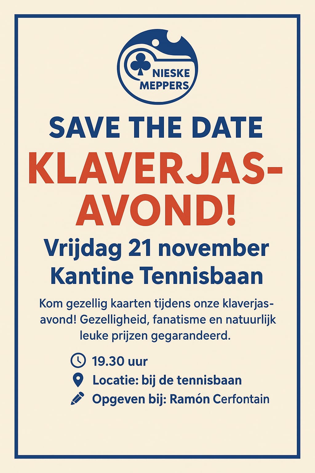 Klaverjassen bij ons in de kantine. Aanvang: 19:30 uur. Een gezellige avonden uiteraard met leuke prijzen. Opgave bij Ramon Cerfontain. Tel: 0629075265.